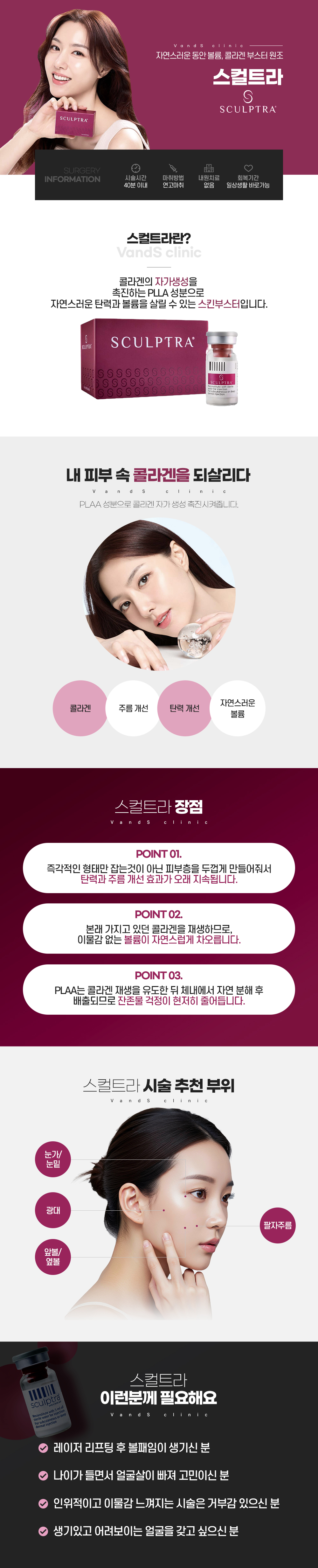 스컬트라는 PLLA라는 콜라겐생성유도물질로 구성된 시술로, 피부에 주입되면 콜라겐의 지속적인 재생성을 유도합니다. 이로 인해 꺼진 부위에는 볼륨이 차오르고 피부탄력이 개선되는 효과를 기대할 수 있는 시술입니다.